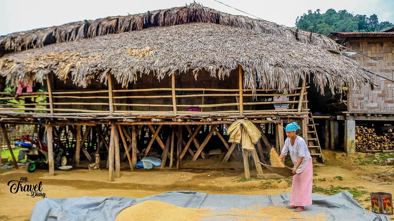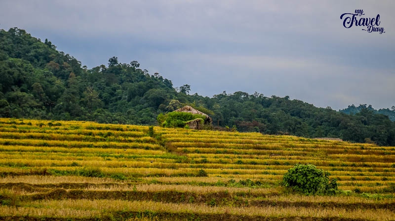 The thatched roof, bamboo stilt houses, golden paddy fields in the background with towering hills presented a serene picture.