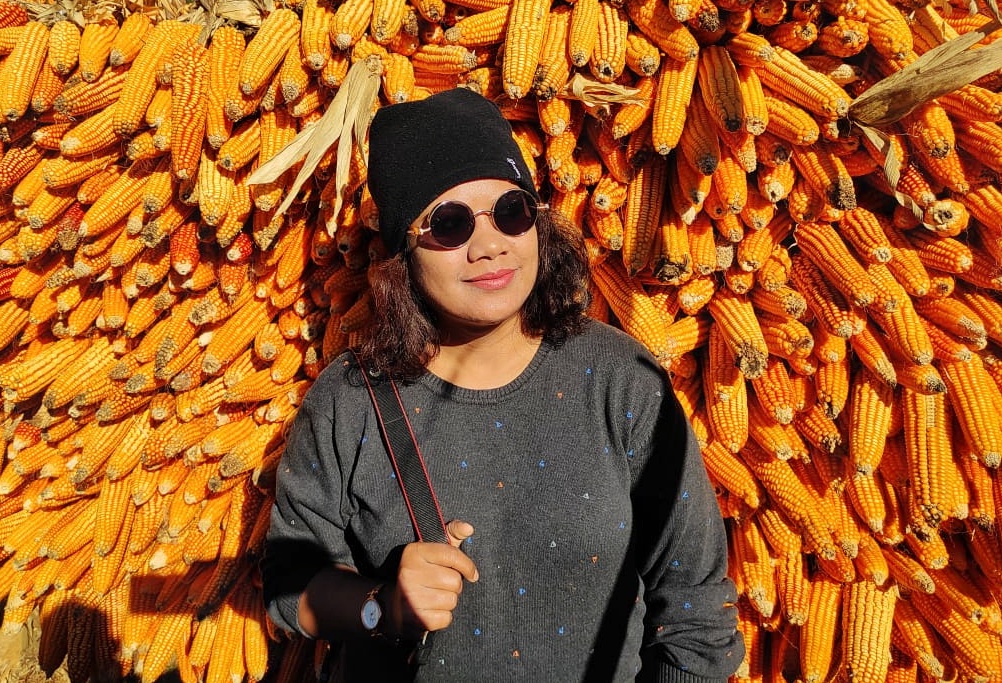 While returning, we took a different route down to the valley. It took us to picturesque scattered villages with farmlands around. The sun-dried chilies on the roof of huts were a common sight. The bright orange color corn stack added the much-needed charm to the view.