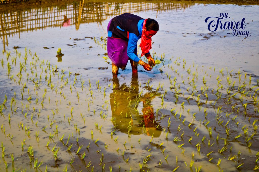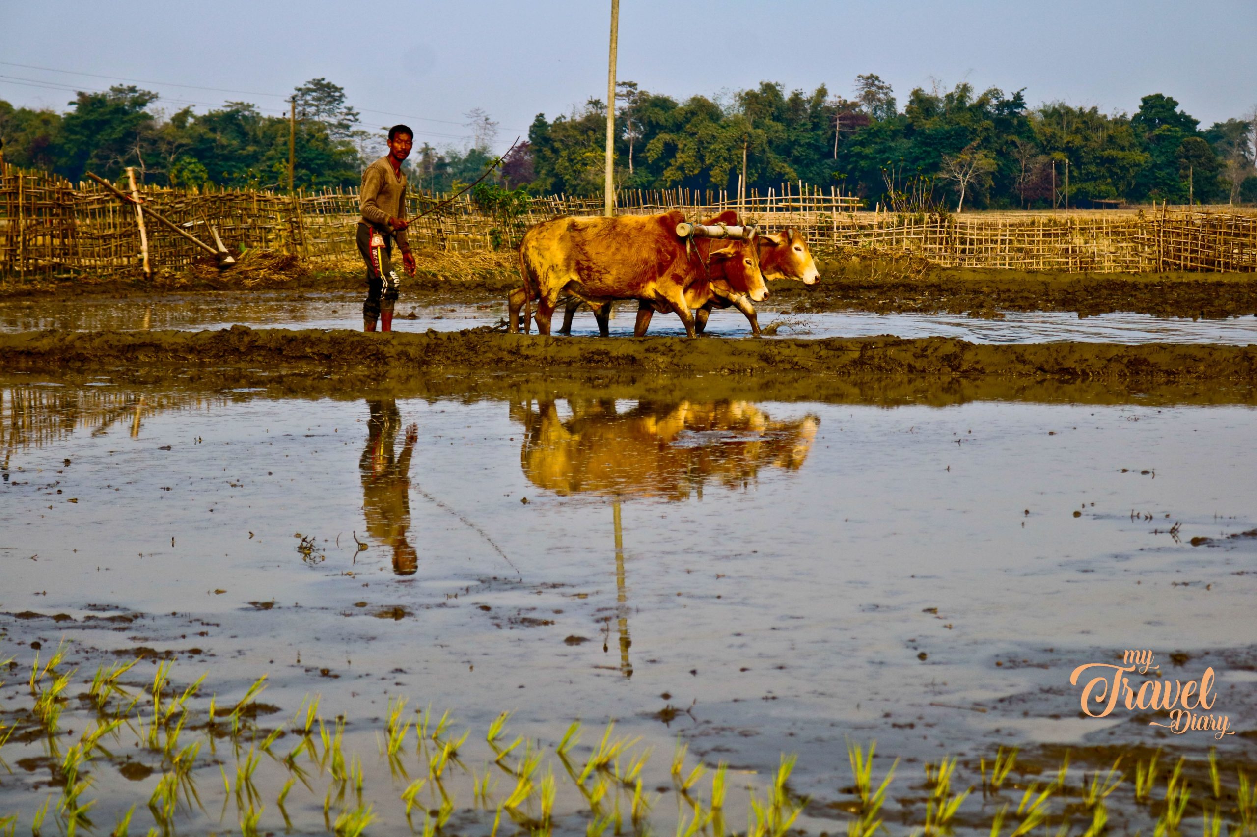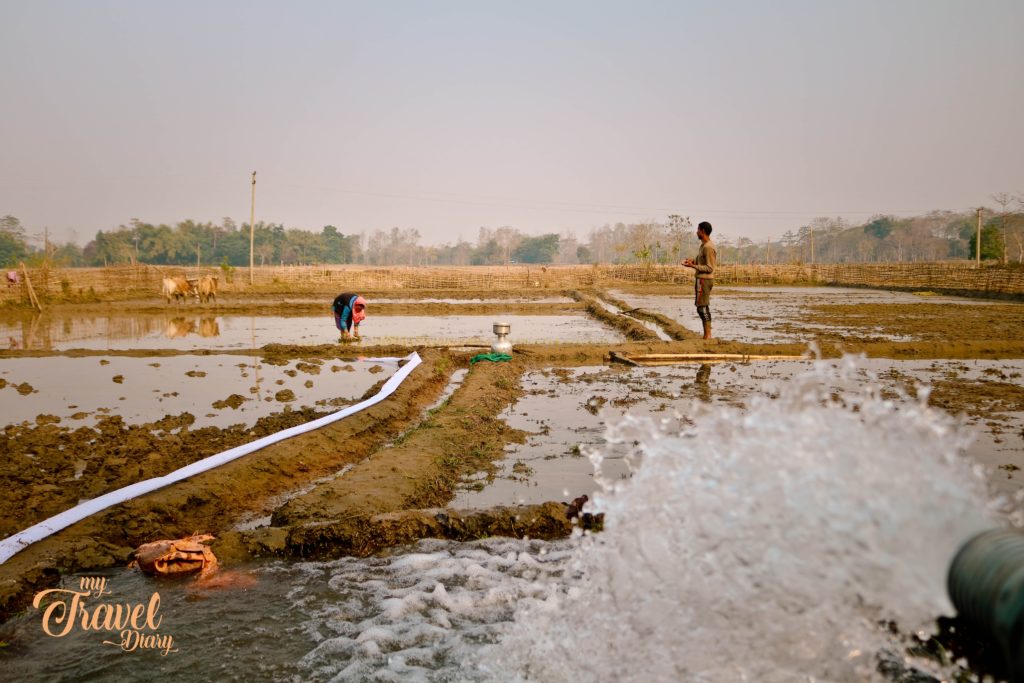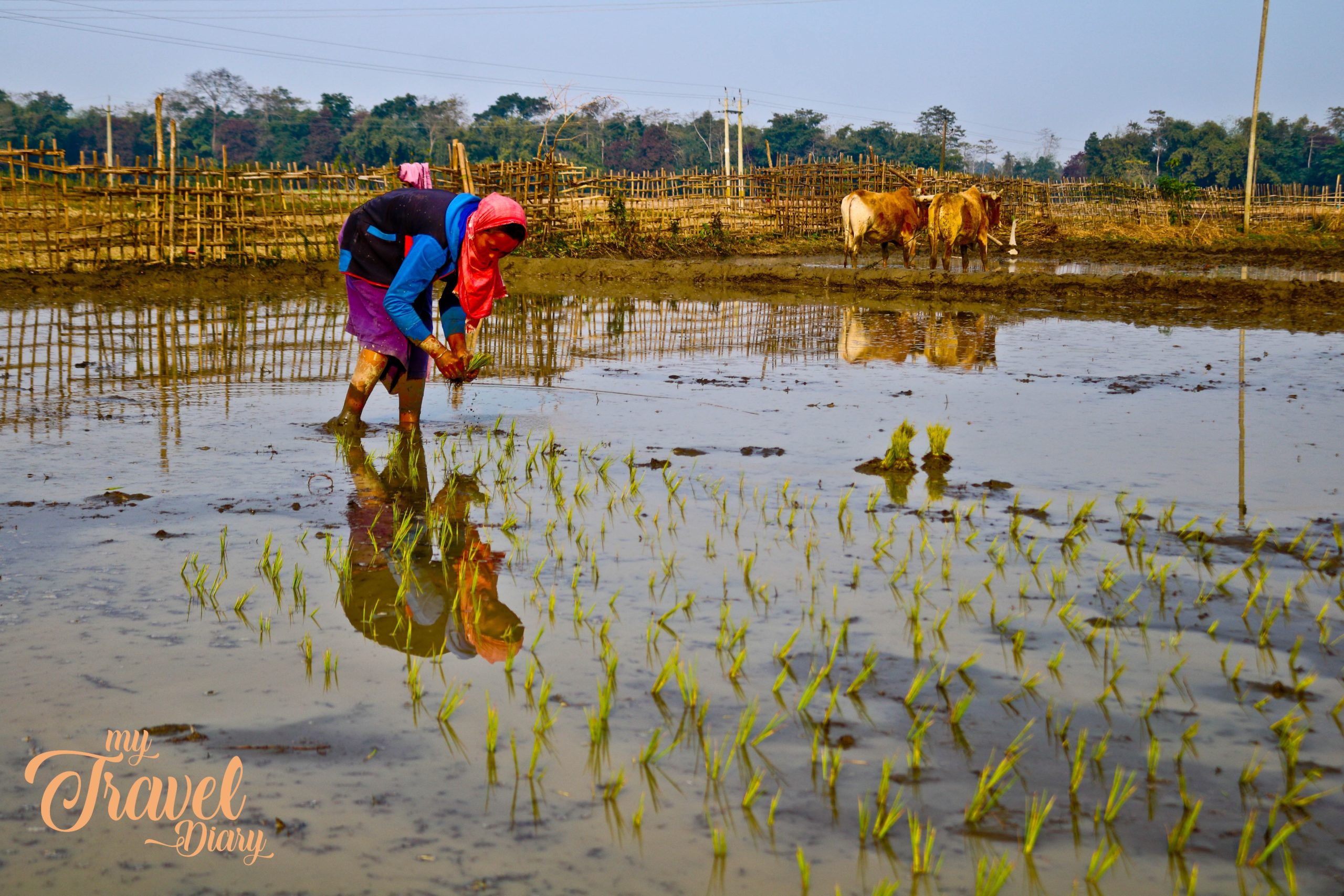A few blocks away, I saw a Mishing woman busy in the rice field, half of her legs buried in the muddy watery field. The raw and rustic lifestyle of the Mishing Tribe of Majuli was beyond fascinating. Irrespective of the main focal attraction, that’s the Neo-Vaishnavite Satras, I had decided to spend my time in the river island with the Mising Tribe.