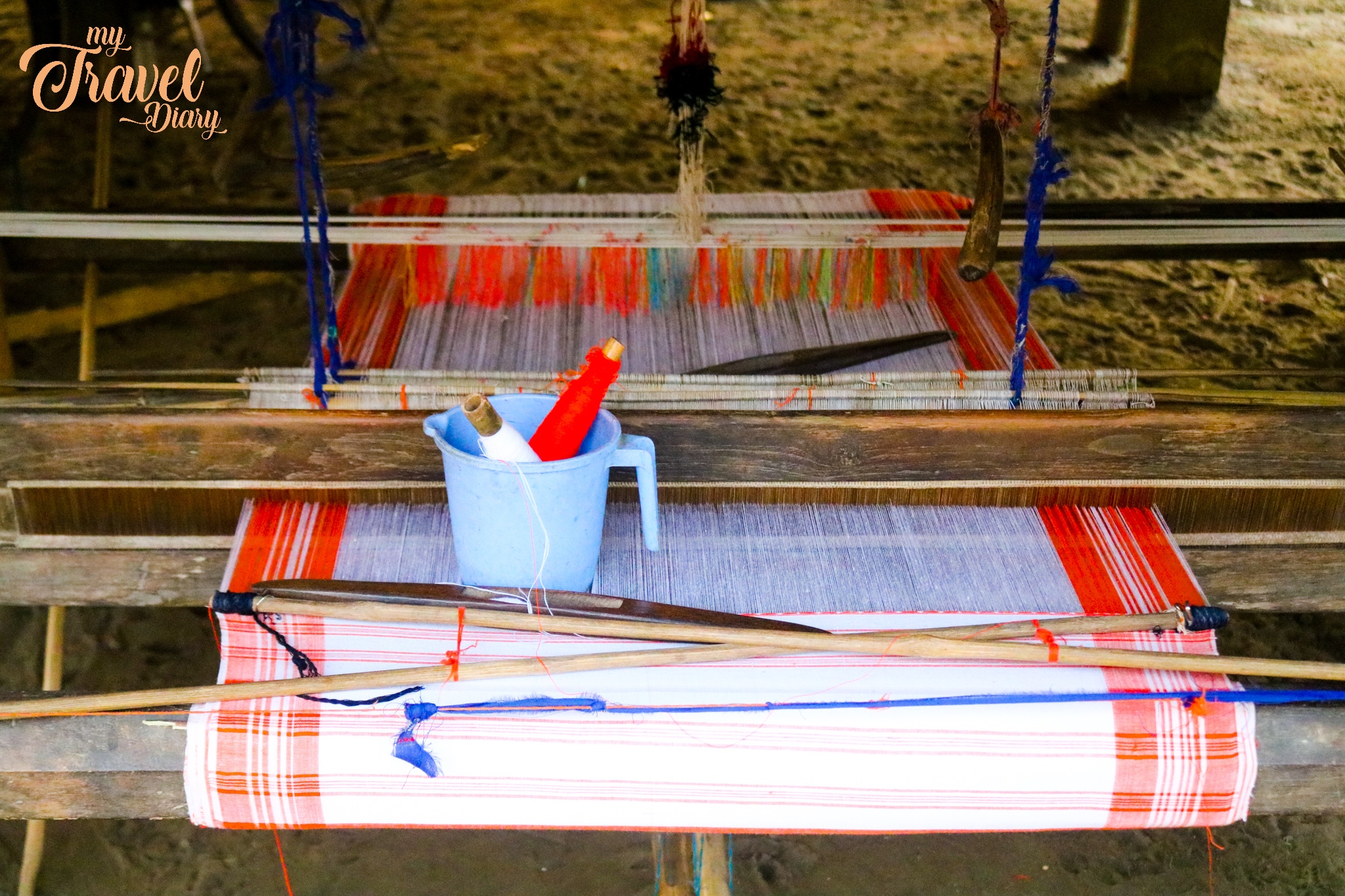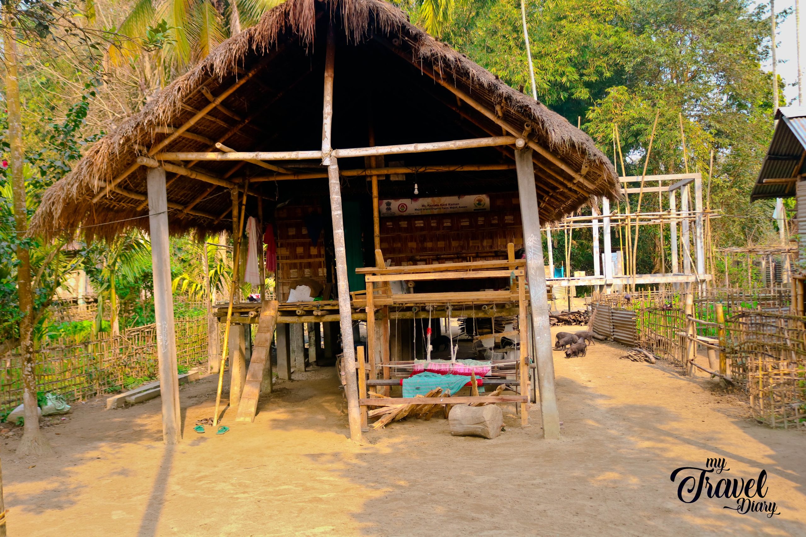 The loom is mostly placed under the platform only. Therefore, don’t be surprised if a Mishing woman ignores you. Most probably she is busy on the loom and weaving exquisite Mekhala Chador.