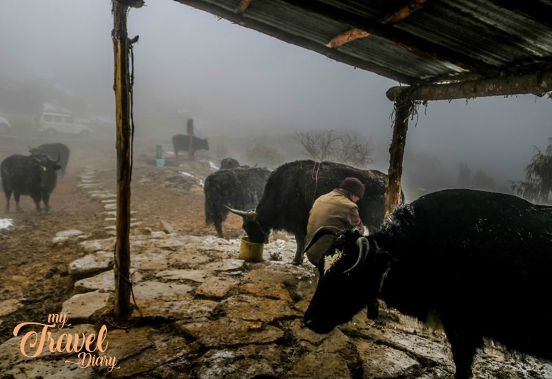 Despite the harsh weather, the Brokpas were busy with their daily chore. While the Brokpa man was busy milking the yak while chanting Buddhist mantras, the lady was making yak cheese which is an indispensable part of their food culture.