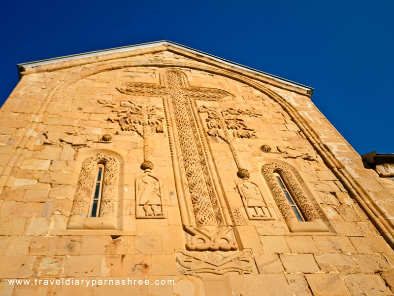 The larger of which, known as the Assumption Church, bears quite impressive traditional Georgian architectural design. You will notice the traditional Georgian Orthodox grapevine cross carved into its façade, some stone carvings, and various ancient scripts.