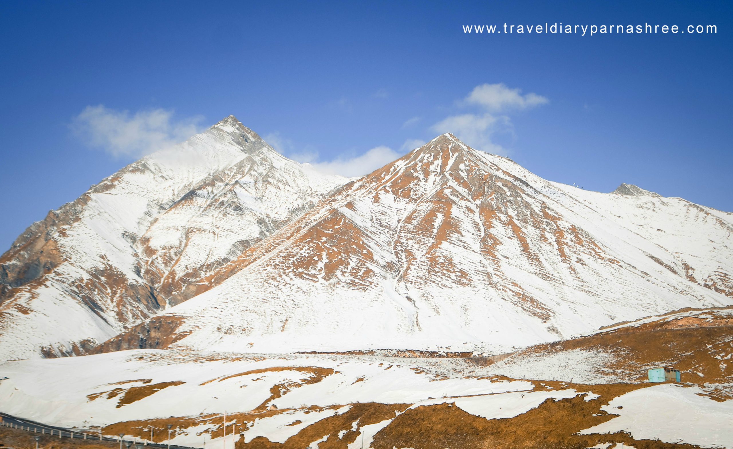 The snow-laden Caucasus Mountains looked eye-arresting. Dazzling mountain peaks in that sun-kissed morning, the winding road and freezing cold, I was literally in a winter wonderland of Georgia.