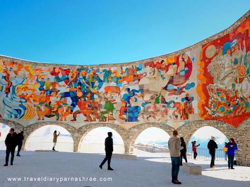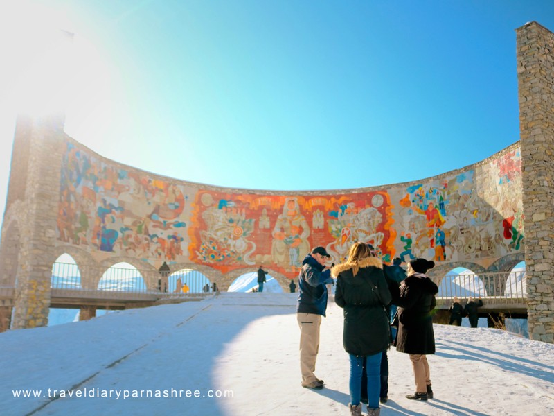 The large round stone and concrete-shaped platform overlook the giant Caucasus Mountains and the Devil’s Valley. The wall of the monument depicts scenes of Georgian and Russian history. This is a great viewing platform that pans around the valley and the mountains.